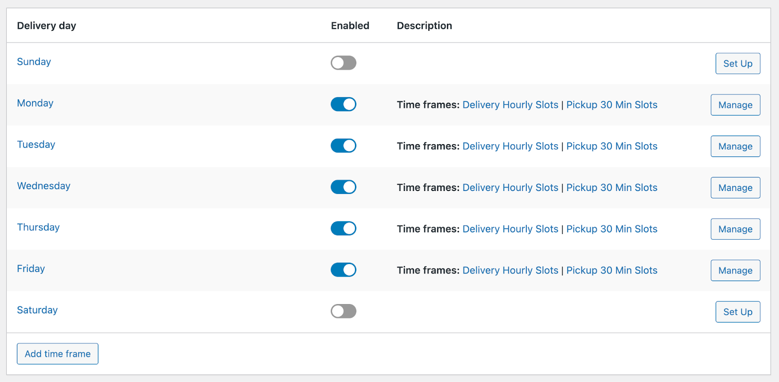 These two scheduling tabs allow you to define days, timeframes, and ranges independently for delivery and pickup, giving you significantly more flexibility and control over how each option is configured.