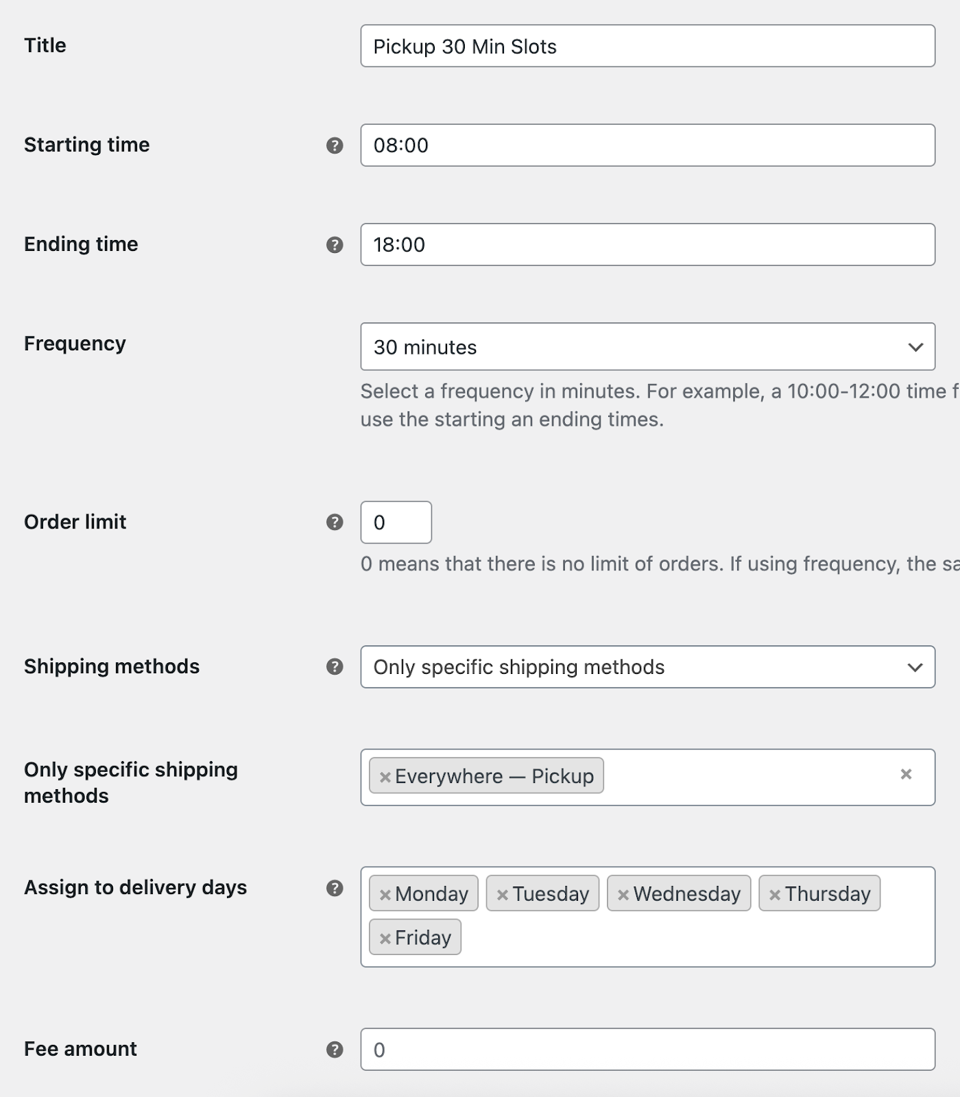 Then, in Pickup scheduling, enable the pickup days and add your pickup timeframes – effectively recreating the previous Pickup 30 Min Slots configuration.
