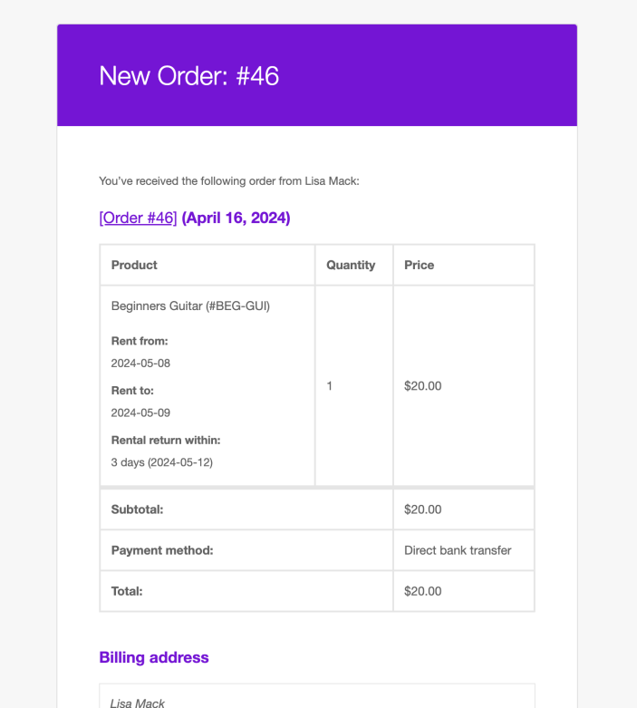 Lastly, customers will receive an order notification from your store that will include the rental information for your customer’s reference.
