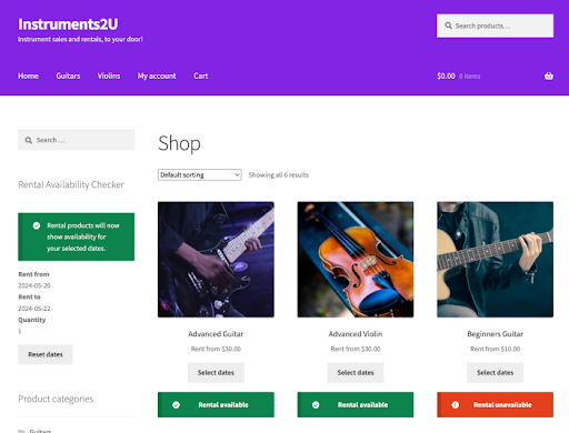 Rental Products offers a visual availability checker, which can be added as either a shortcode or a block on any page, for all your rental products. Your customers can quickly determine if your products are available to rent within any date range.