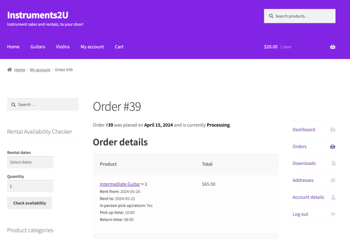 After placing an order for a rental product, the customer can find the order details of their booking in their account page.